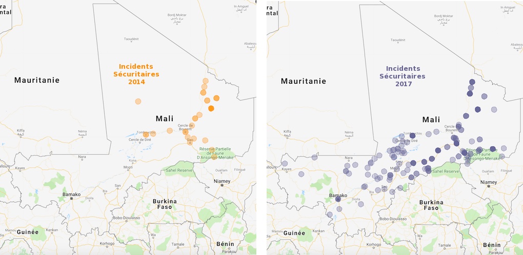 En 2014, la crise au Mali avait fait 331 victimes (morts et blessés); en 2017, c'est au moins 1123 victimes - une progression annuelle de 50%! Les officiels ne parlent même plus des 200.000 réfugiés et déplacés de la crise. La mise en oeuvre de l'Accord de Paix signé en 2015 est incertaine. Plusieurs pays interdisent désormais à leurs citoyens à venir au Mali.